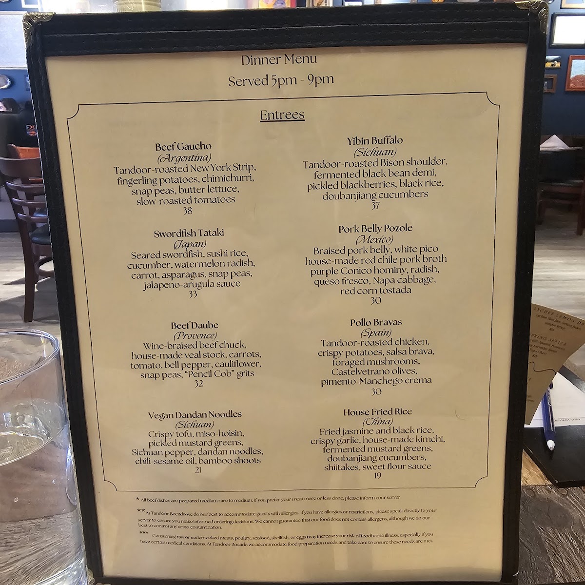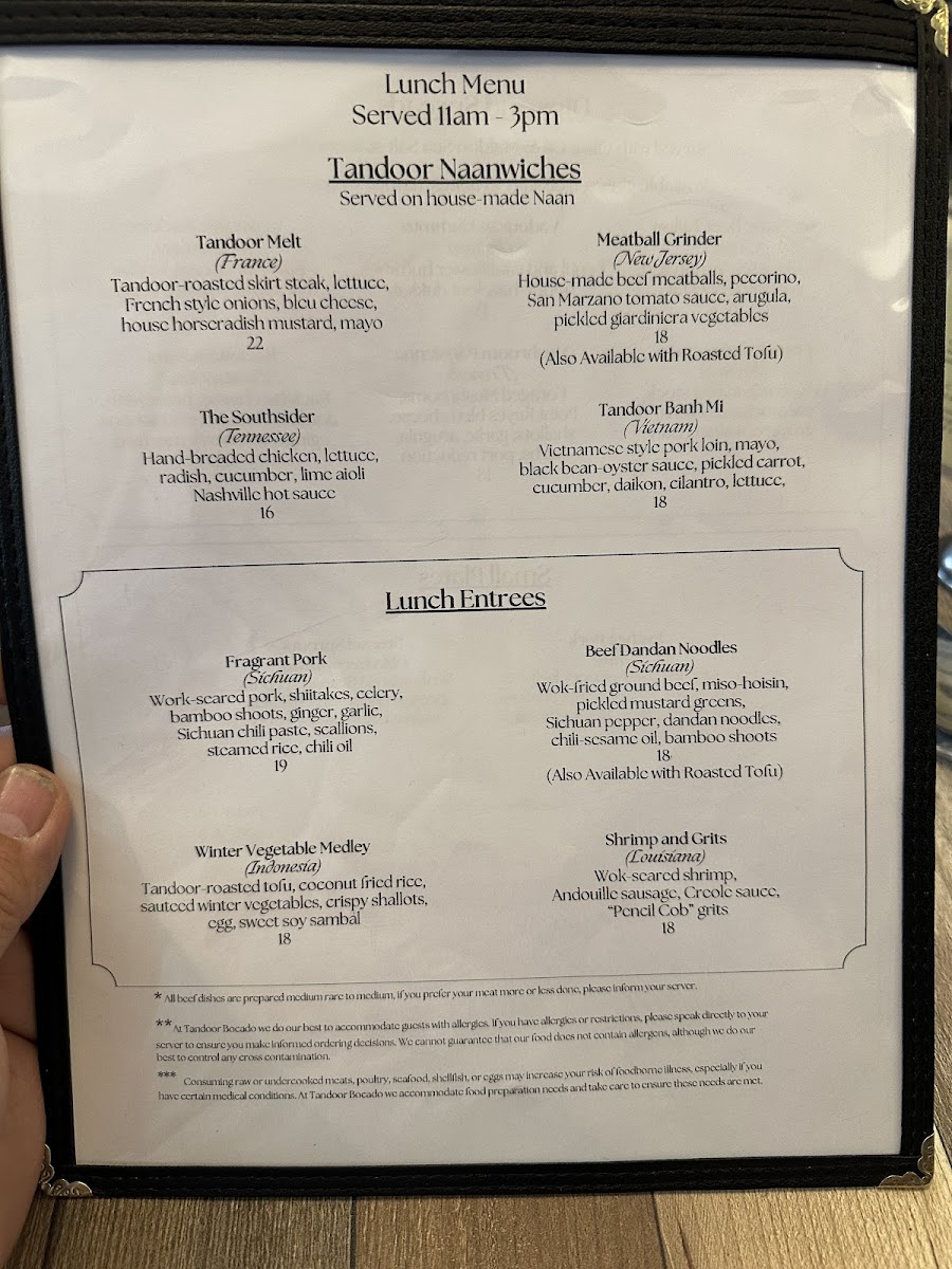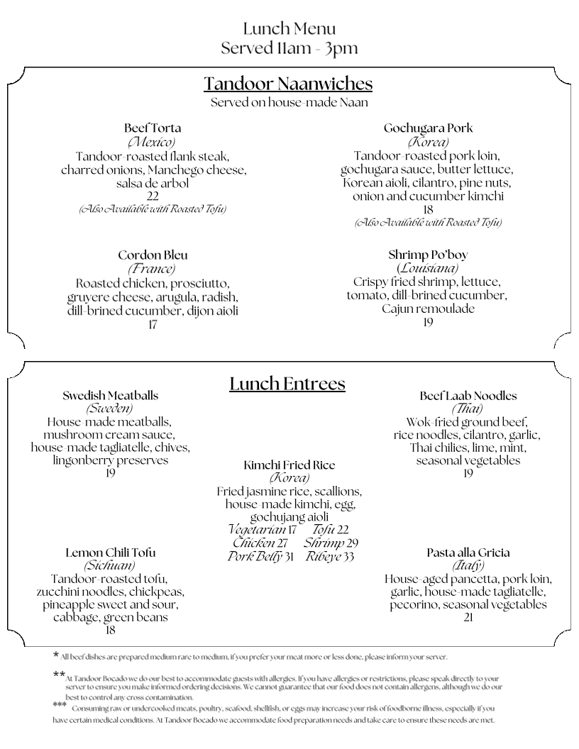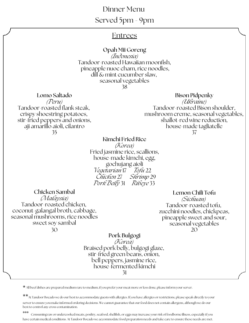 The lunchtime offerings bring comfort and bold flavors together. Tandoor Naanwiches (11am-3pm) such as the Beef Torta, Cordon Bleu, Gochugara Pork, and Shrimp Po’boy reinterpret familiar sandwich concepts through a tandoor-inspired lens. Alongside them, the Lunch Entrees (11am-3pm)-including Swedish Meatballs, Kimchi Fried Rice, Lemon Chili Tofu, Beef Laab Noodles, and Pasta alla Gricia-showcase a strong mix of international comfort food and contemporary flair. As evening arrives, the Dinner Entrees (5pm-9pm) elevate the experience further with standout dishes like Opah Mii Goreng, Lomo Saltado, Chicken Sambal, Kimchi Fried Rice, and Bison Pidpenky, reinforcing the restaurant’s commitment to bold flavors and diverse influences. Overall, the menu reads as a cohesive conclusion to Tandoor Bocado’s culinary story: a place where global inspirations meet local ingredients in a way that feels both approachable and memorable.