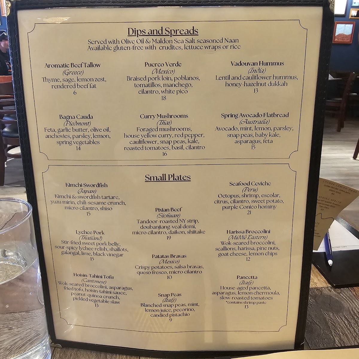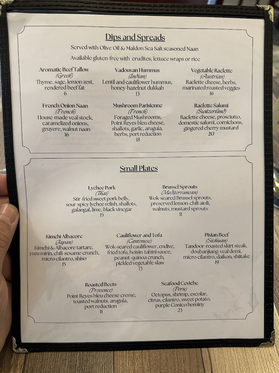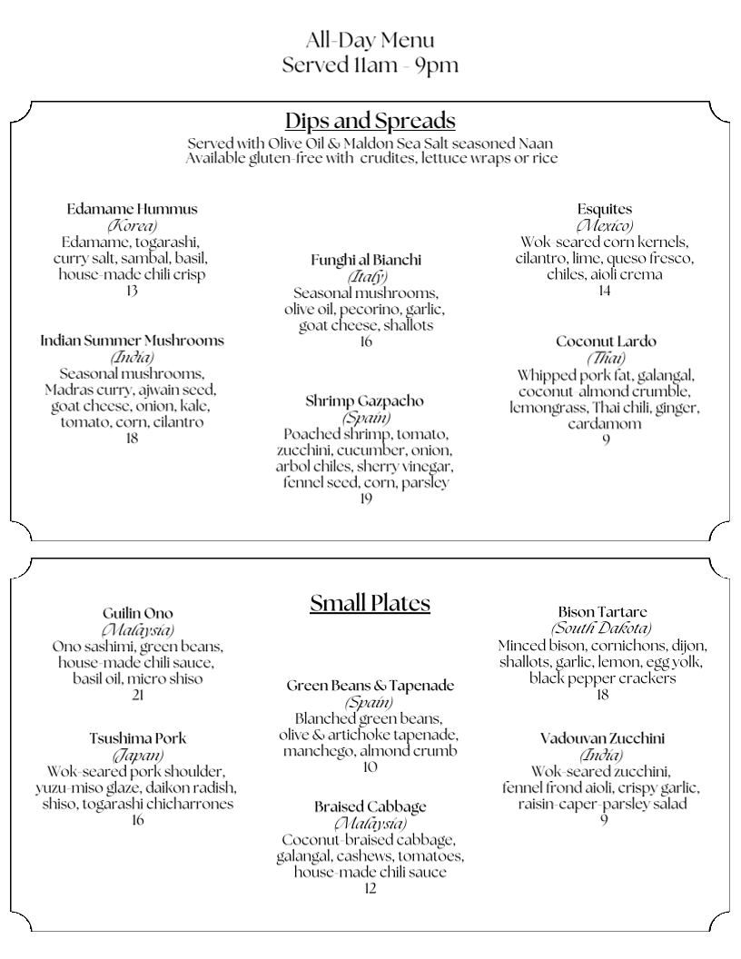 From a reviewer’s perspective, the menu at Tandoor Bocado feels like a confident culinary summary of the restaurant’s identity-globally inspired, modern, and thoughtfully structured across the day. The Small Plates (11am-9pm) immediately set the tone with adventurous options such as Guilin Seabass, Tsushima Pork, Green Beans & Tapenade, Braised Cabbage, and Bison Tartare, offering a balance between refined seafood, rich meats, and vegetable-forward dishes. Moving into Dips and Spreads (11am-9pm), items like Edamame Hummus, Funghi al Bianchi, Shrimp Gazpacho, Esquites, and Coconut Lardo highlight creativity and shareability, making them ideal for easing into the meal or enjoying communally.